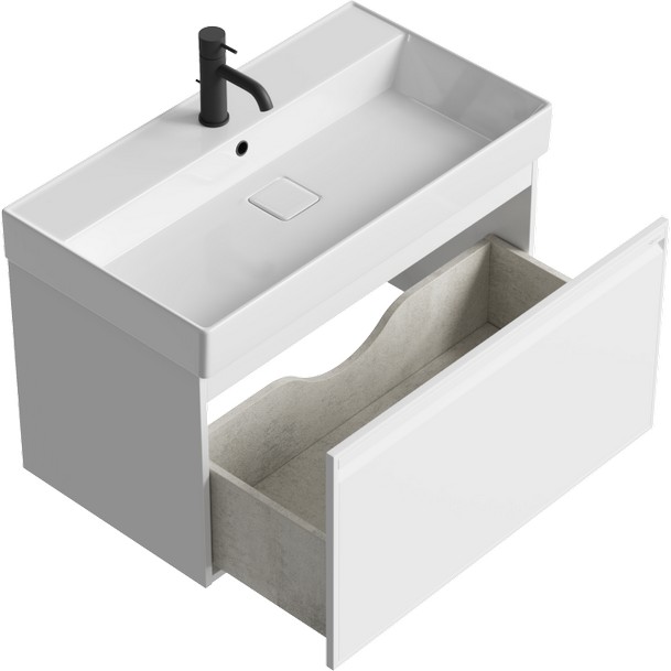 Описание: Подвесная тумба Аквелла Pure 80 с керамическим умывальником – строгая геометрия линий, чистота форм и минималистичная ручка. Фасадные и боковые части мебели изготовлены из влагостойкого MDF окрашенные в матовый белый цвет. Ящик оснащен системой полного выдвижения и плавного закрывания. Отделка внутренних элементов мебели особым цветом под бетон. |