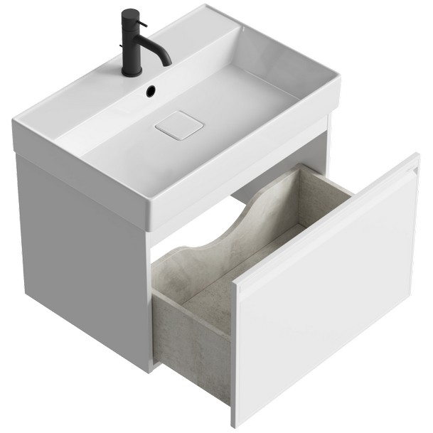 Описание: Подвесная тумба Аквелла Pure 65 с керамическим умывальником – строгая геометрия линий, чистота форм и минималистичная ручка. Фасадные и боковые части мебели изготовлены из влагостойкого MDF окрашенные в матовый белый цвет. Ящик оснащен системой полного выдвижения и плавного закрывания. Отделка внутренних элементов мебели особым цветом под бетон. |