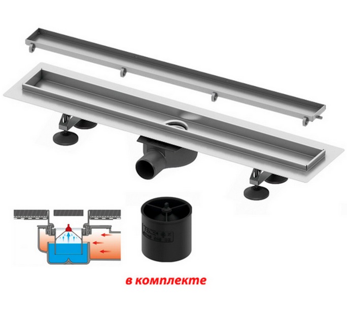 Описание: Комплект TECElinus для монтажа дренажного канала 2 в 1, с основой для плитки “tile” и “steel”, с мембраной 600 мм Размер:600 мм Длина канала L с фланцами: 600 мм Длина лотка L-60: 540 мм Комплектация: -дренажный канал из нержавеющей стали; -cифон DN 50, выход вбок, производительность (согласно DIN EN 1253) при уровне воды 10/20 мм -над решеткой: 0,7/0,8 л/с; уровень гидрозатвора = 25 мм согласно DIN EN 1253; -гидроизоляционная манжета; -погружной стакан с мембраной; -4 опоры, высота до 125 мм (до уровня чистового пола); -основа для плитки “tile” и “steel” 2 в 1 |